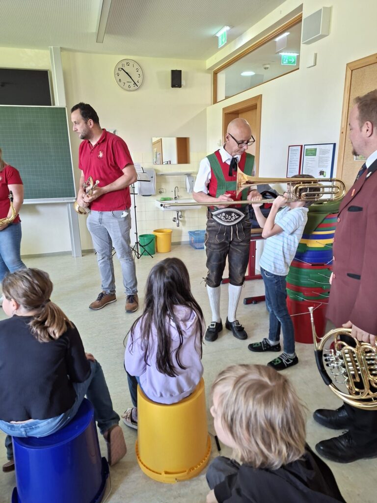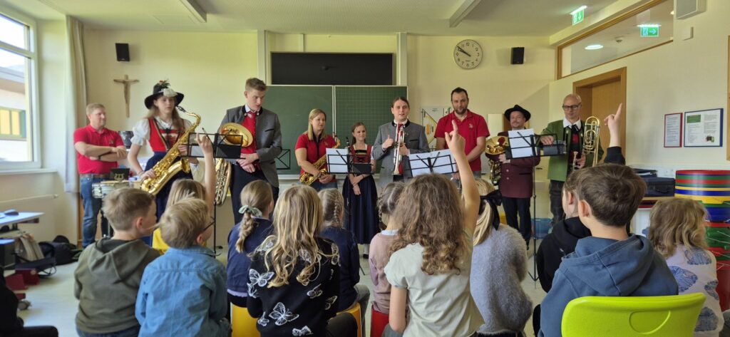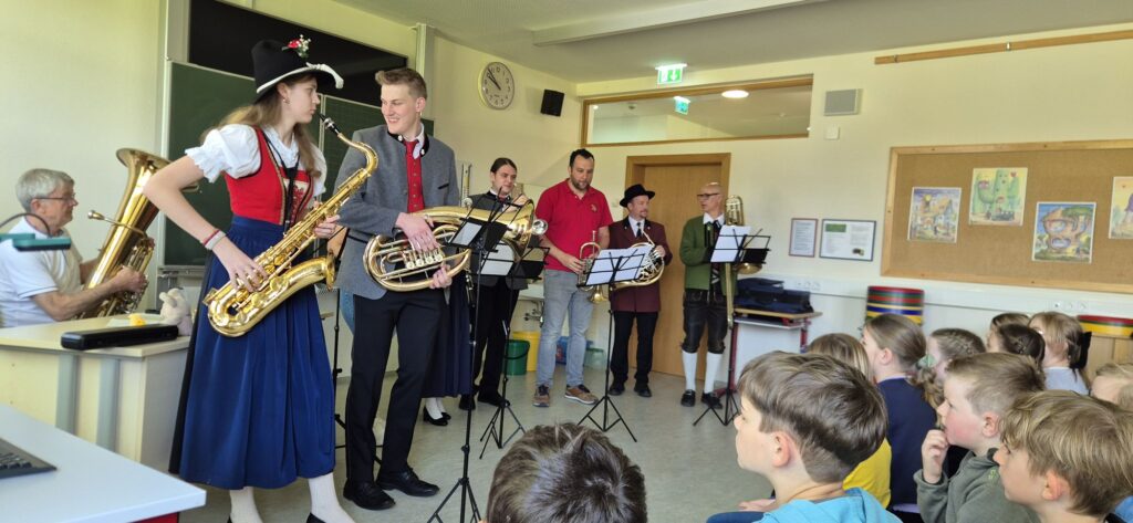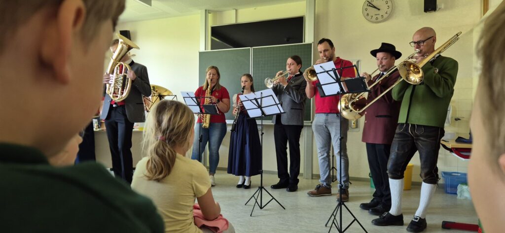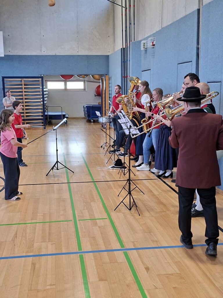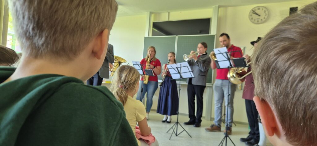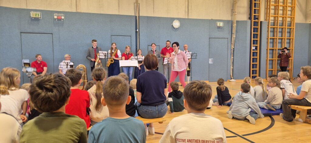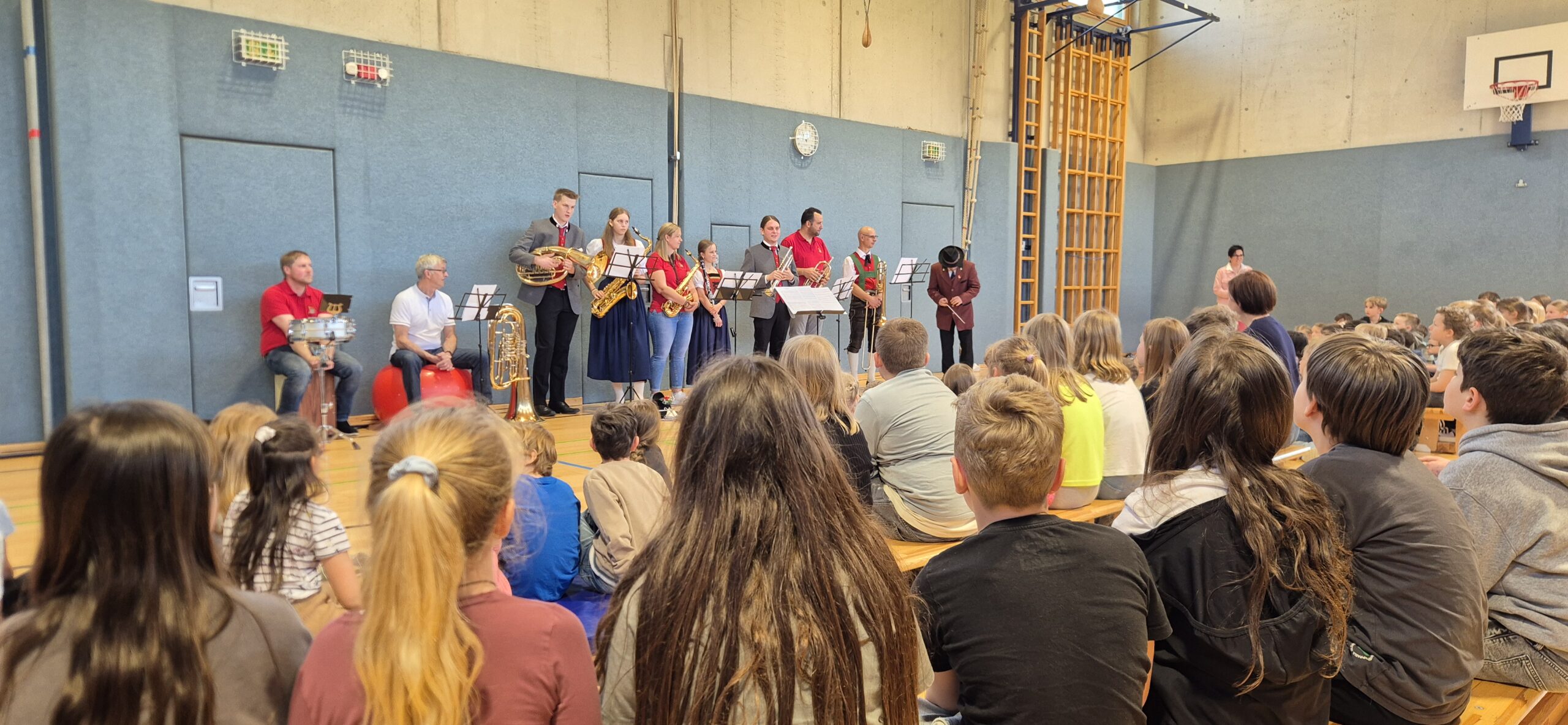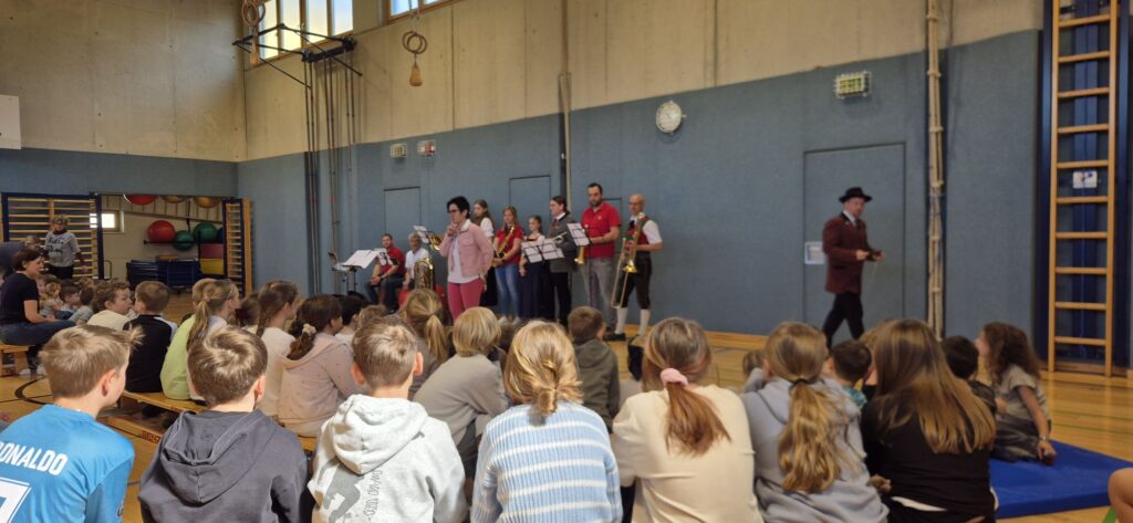 Zum Abschluss gab die Musikkapelle ein kleines Konzert in der Turnhalle. Alle Kinder der Schule waren eingeladen und konnten die musikalische Darbietung genießen. Die abwechslungsreichen Stücke sorgten für viel Freude und einen gelungenen Ausklang dieses besonderen Vormittags.