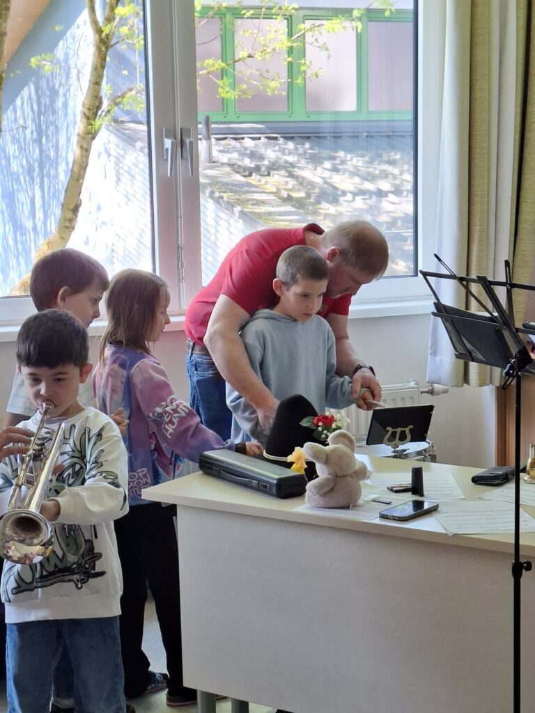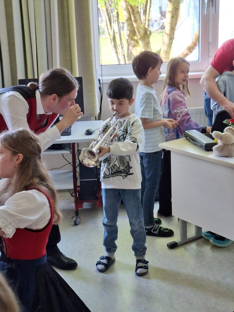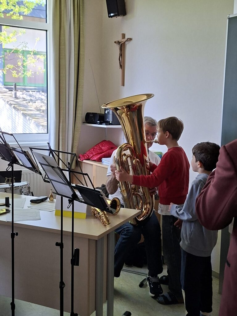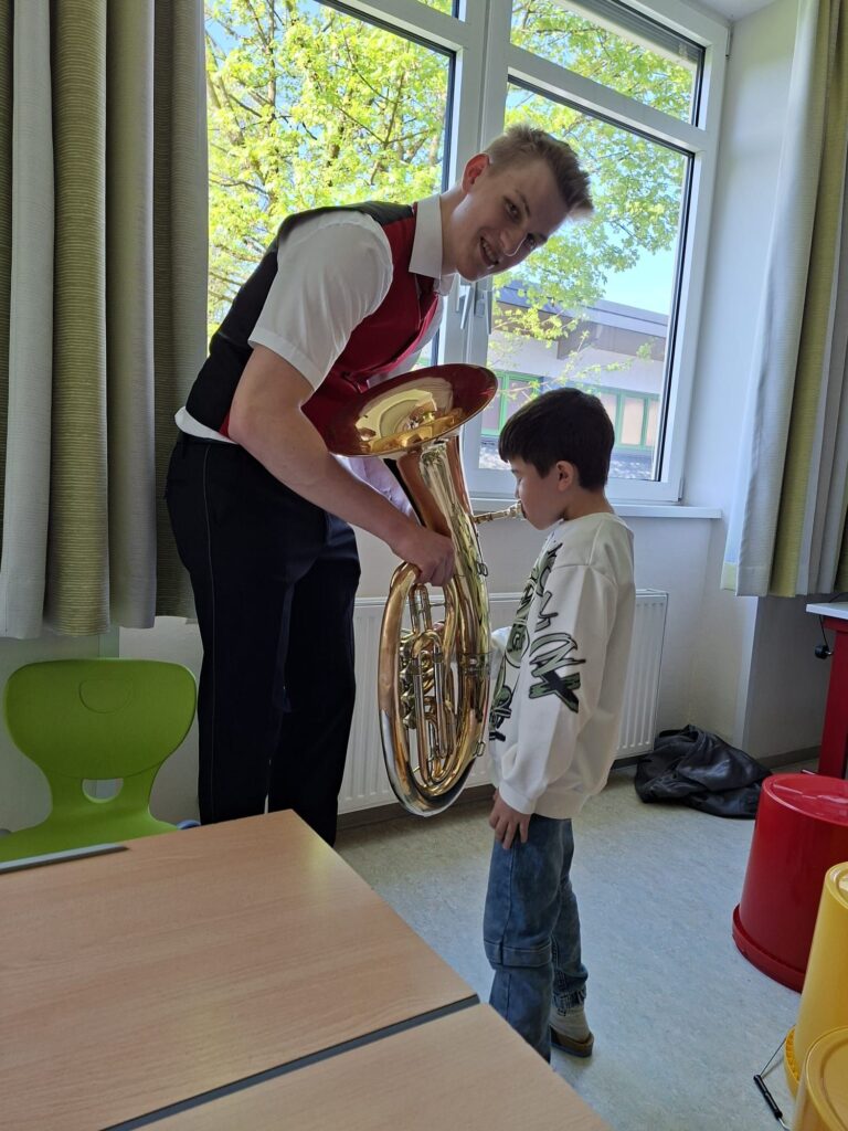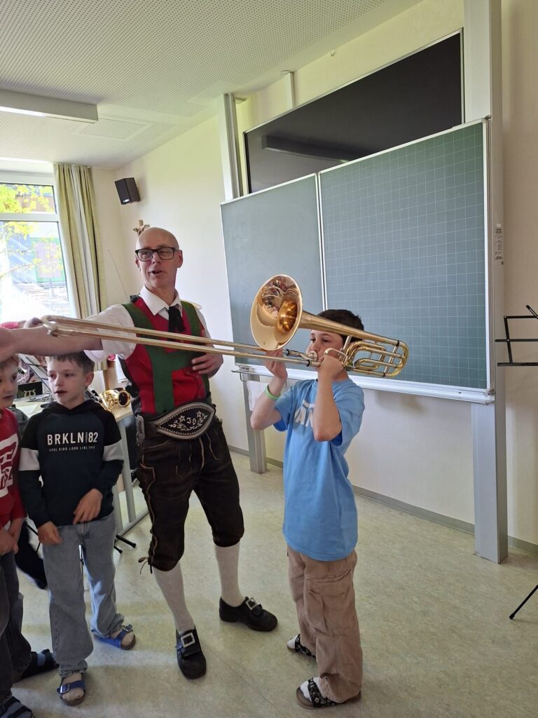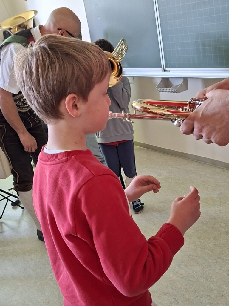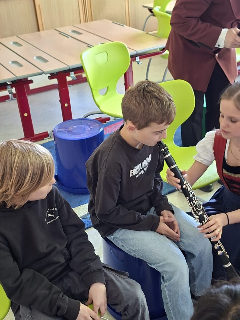 Die Kinder der 2. Klassen hatten die spannende Gelegenheit, verschiedene Instrumente kennenzulernen und selbst auszuprobieren. Mit großer Begeisterung wurden Trompete, Klarinette, Schlagzeug und viele weitere Instrumente getestet. Dabei konnten die Schülerinnen und Schüler nicht nur hören, wie die Instrumente klingen, sondern auch selbst erste Töne erzeugen.