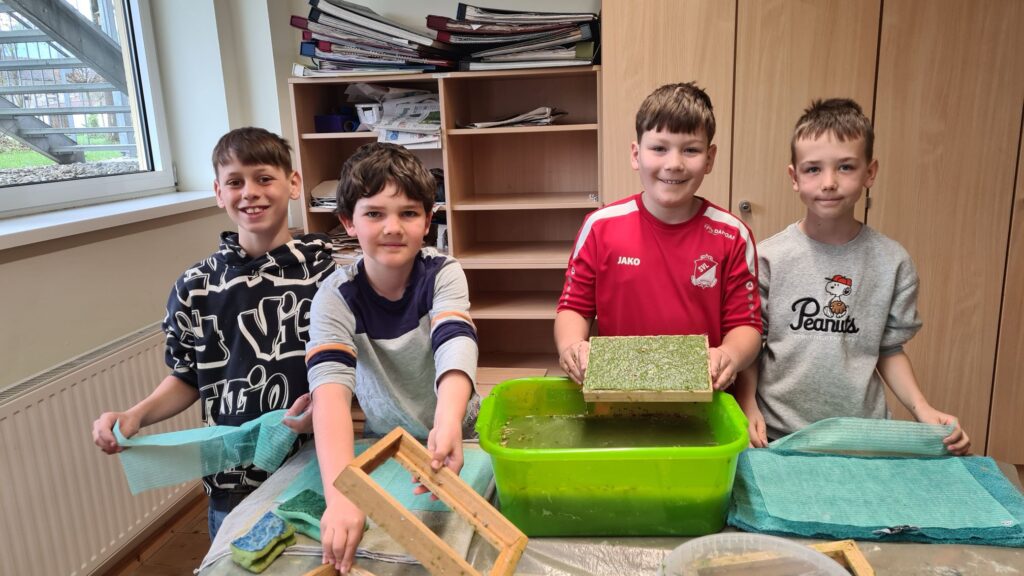 Am Freitag, den 10. April 2026 besuchte uns Frau Grothues, um mit uns Papier zu schöpfen. Zuerst klärten wir Fragen wie: Woraus besteht Papier? Wo gibt es überall Papier? Warum ist es sinnvoll neues Papier entstehen zu lassen?