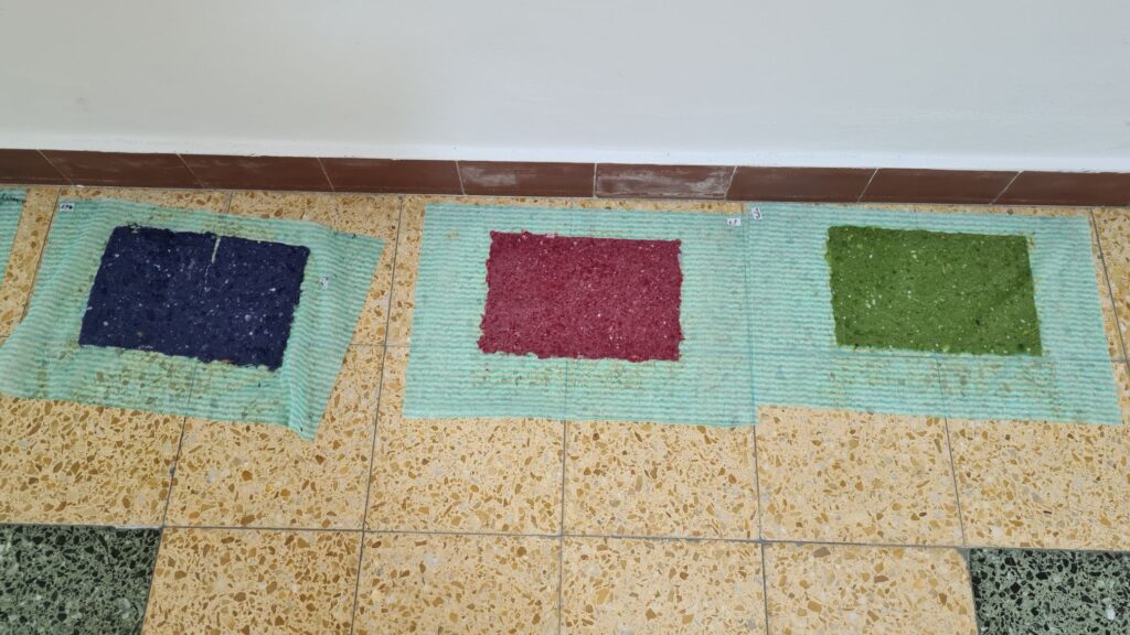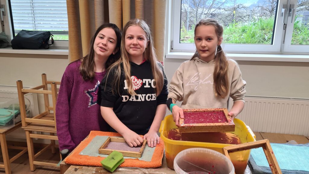 Nach einigen präzisen Anleitungen konnten die Kinder selbstständig das erste Papier schöpfen. Dies war für die Schüler und Schülerinnen ein sehr spannendes Erlebnis, da jedes Papierstück ein Unikat war. Sie stellten auch Blütenpapier verziert mit Rosenblättern oder getrockneten Brennnesseln her. Zum Schluss kreierte jeder aus der Pulpe noch zwei Herzchen.